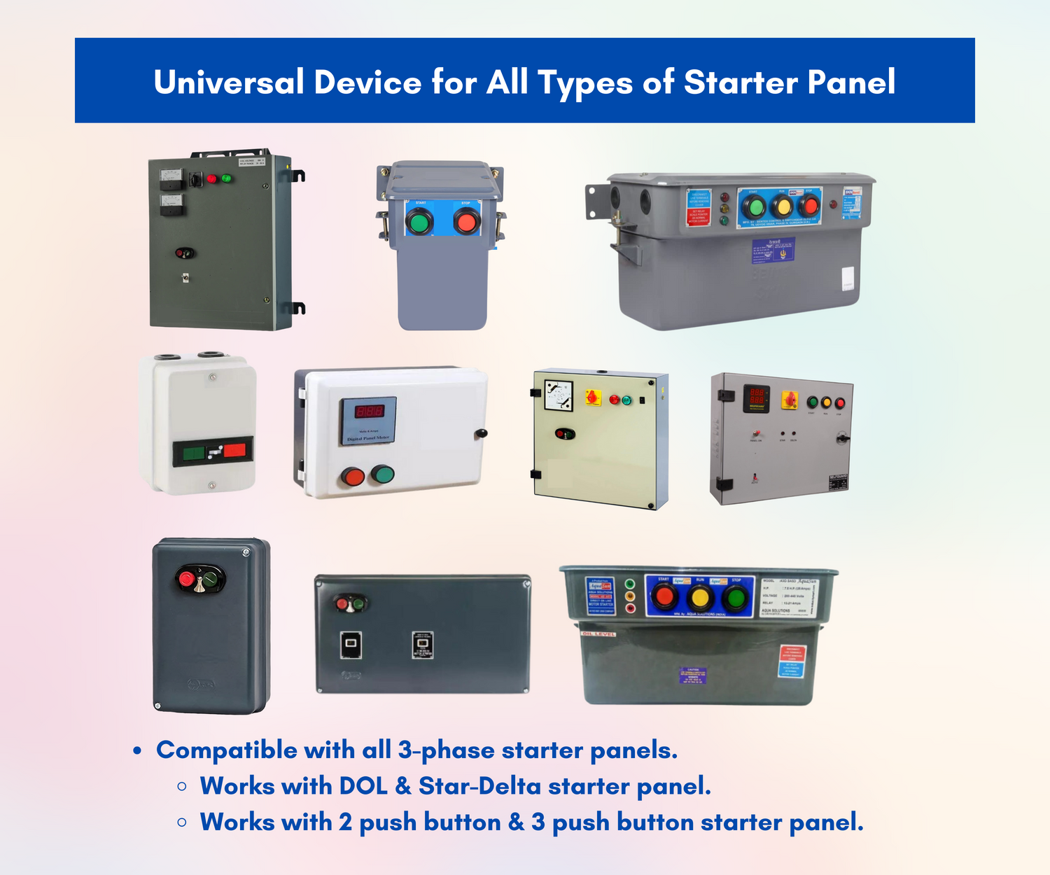 Connects to Your Existing Setup: This device easily attaches to the majority of three phase motor starter panels, whether it's a simple contactor panel, a standard panel with Green (On) & Red (Off) push buttons, or common starter types like DOL and Fully Automatic Star Delta used with openwell, monoblock, or borewell submersible pumps.